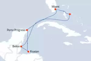 Itinerario : Miami, Cozumel, Costa Maya, Santo Tomas, Belice, Roatan, Miami, Saint John's, Terre de Haut, Philipsburg, San Juan