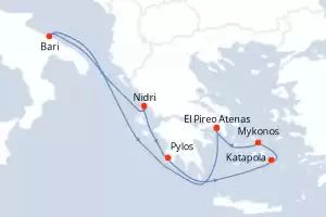 Itinerario : El Pireo Atenas, Bari, Nidri, Pylos, Katapola, Mykonos, El Pireo Atenas
