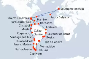 Itinerario : Southampton, Hamilton, Puerto Canaveral, Fort Lauderdale, Grand Turk, Barbados, Fortaleza, Salvador de Bahia, Buzios, Rio de Janeiro, Santos, Montevideo, Buenos Aires, Puerto Madryn, Ushuaia, Cap Horn, Punta Arenas, Glaciar Amalia Canal, Glaciar Pio X, Puerto Montt, Santiago de Chile, Coquimbo, Cristobal, Callao, Manta, Fuerte amador, Canal de Panama, Aruba, Fort Lauderdale, Puerto Canaveral, Punta Delgada, Southampton
