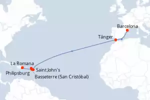 Itinerario : Barcelona, Tánger, Saint John's, Philipsburg, Basseterre (St Kitts), La Romana