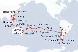 Itinerario : Tokyo, Keelung, Hong Kong, Subic bay, Boracay, Puerto Princesa, Benoa, Darwin, Cairns, Brisbane, Sidney, Nouméa, Lifou, Suva, Nukualofa, Rarotonga, Papeete, Pitcairn, Isla de Pascua, San antonio Chile, Puerto Montt, Chacabuco, Punta Arenas, Ushuaia, Puerto Madryn, Buenos Aires