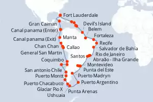 Itinerario : Fort Lauderdale, Gran Caiman, Canal panama (Enter), Canal panama (Exit), Fuerte amador, Manta, Chan Chan, Callao, General San Martin, Coquimbo, San antonio Chile, Isla Robinson Crusoe, Puerto Montt, Puerto Chacabuco, Glaciar Pio X, Punta Arenas, Ushuaia, Puerto Argentino, Puerto Madryn, Punta del Este, Montevideo, Buenos Aires, Santos, Abraão - Ilha Grande, Rio de Janeiro, Salvador de Bahia, Recife, Fortaleza, Belem, Devil's Island, Barbados, Santa Lucia, St Kitts, San Juan, Fort Lauderdale