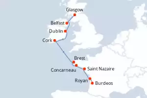 Itinerario : Glasgow, Belfast, Dublin, Cork, Brest, Concarneau, Saint Nazaire, Royan, Burdeos