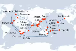 Itinerario : San Francisco, Honolulu, Hilo, Papeete, Suva, Lifou, Nouméa, Sidney, Newcastle (UK), Cairns, Rabaul, Tokyo, Kobe, Nagasaki, Pusan, Keelung, Hong Kong, Nha Trang, Phu My, Ko Samui, Singapur, Port Kelang, Penang, Colombo, Male, Port Louis, Durban, Puerto Elizabeth, Le Cap , Walvis Bay, Mindelo, Las Palmas, Barcelona