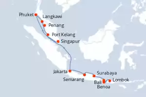 Itinerario : Singapur, Phuket, Langkawi, Penang, Port Kelang, Jakarta, Semarang, Surabaya, Bali, Lombok, Benoa