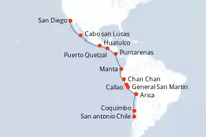 Itinerario : San Diego, Cabo san Lucas, Huatulco, Puerto Quetzal, Puntarenas, Manta, Chan Chan, Callao, General San Martin, Arica, Coquimbo, San antonio Chile